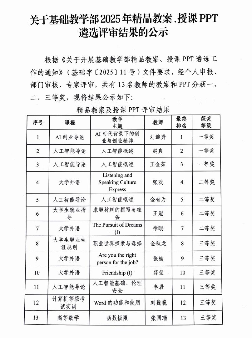 关于基础教学部2025年精品教案、授课PPT遴选评审结果的公示